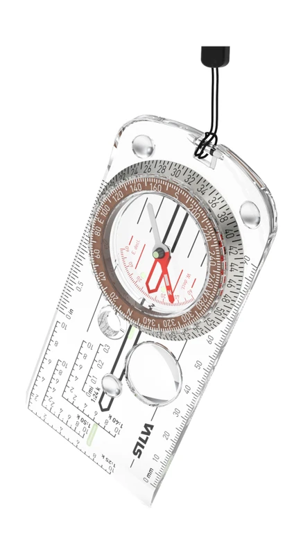 Pokročilá buzola od značky Silva s dvojitým prstencom, zväčšovacím sklíčkom a otvorom pre zakresľovanie značiek na mape.