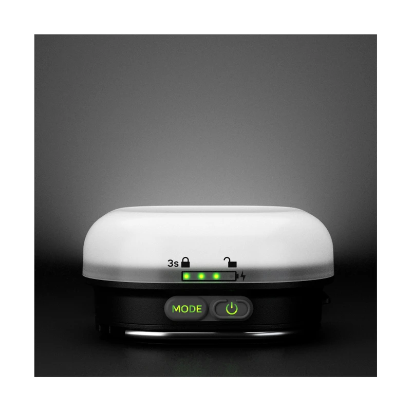 Aby sa predišlo nechcenému zapnutiu kempingovej lampy počas jej prenosu v batohu alebo vo vrecku, obsahuje šikovnú funkciu uzamknutia ovládania. Podržaním tlačidla zapnutia/vypnutia pri vypnutej lampe na dlhšie ako 3 sekundy sa tlačidlá uzamknú. Pri pokuse o zapnutie kempingovej lampy sa rozbliká malé červené svetlo pri ikonke zámku signalizujúce jej uzamknutie. Následným podržaním tlačidla zapnutia/vypnutia sa kempingová lampa odomkne.
