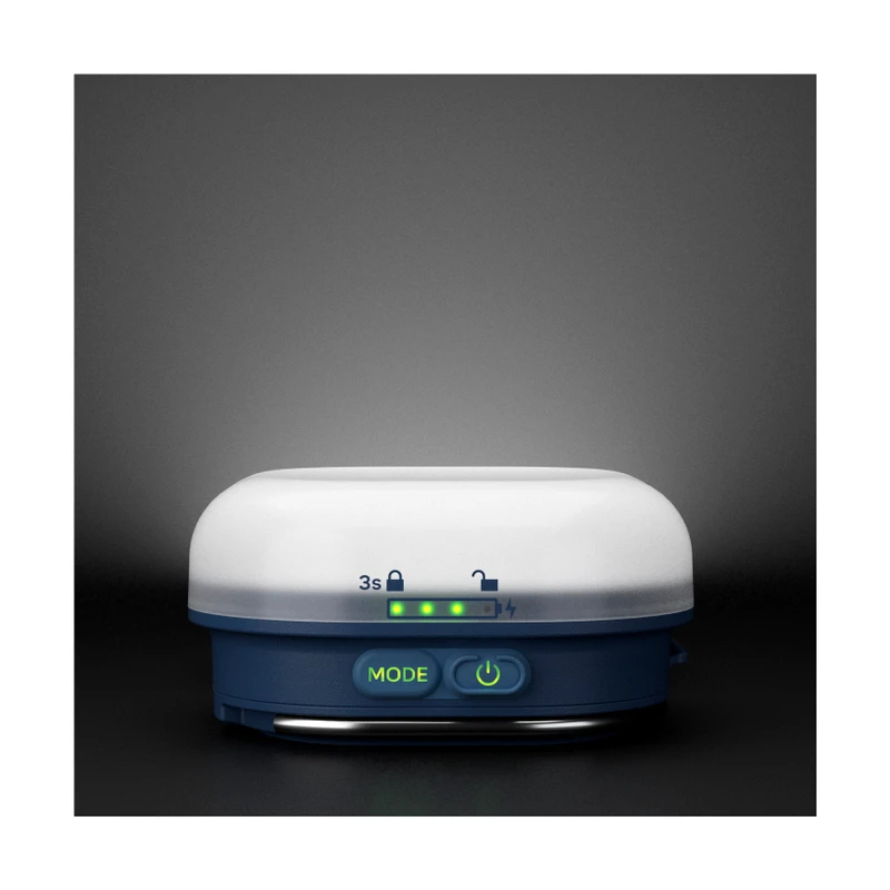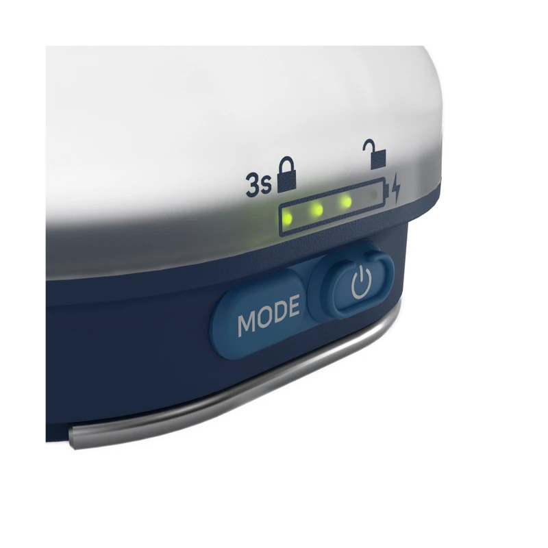 Aby sa predišlo nechcenému zapnutiu kempingovej lampy počas jej prenosu v batohu alebo vo vrecku, obsahuje šikovnú funkciu uzamknutia ovládania. Podržaním tlačidla zapnutia/vypnutia pri vypnutej lampe na dlhšie ako 3 sekundy sa tlačidlá uzamknú. Pri pokuse o zapnutie kempingovej lampy sa rozbliká malé červené svetlo pri ikonke zámku signalizujúce jej uzamknutie. Následným podržaním tlačidla zapnutia/vypnutia sa kempingová lampa odomkne.
