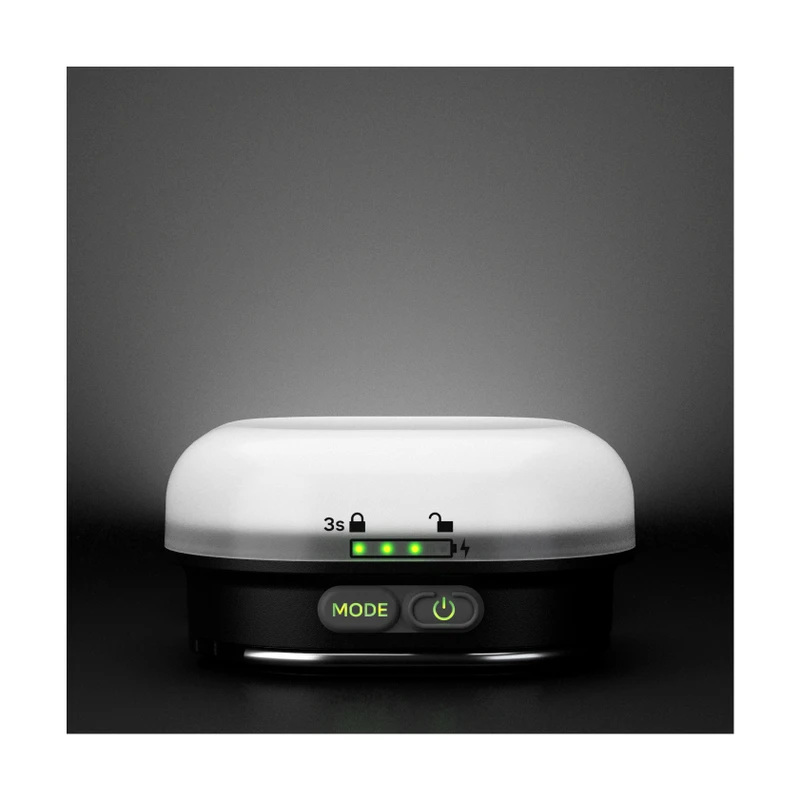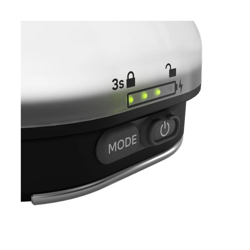 Aby sa predišlo nechcenému zapnutiu nabíjateľnej kempingovej lampy počas jej prenosu v batohu alebo vo vrecku, obsahuje šikovnú funkciu uzamknutia ovládania. Podržaním tlačidla zapnutia/vypnutia pri vypnutej lampe na dlhšie ako 3 sekundy sa tlačidlá uzamknú. Pri pokuse o zapnutie nabíjateľnej kempingovej lampy sa rozbliká malé červené svetlo pri ikonke zámku signalizujúce jej uzamknutie. Následným podržaním tlačidla zapnutia/vypnutia sa nabíjateľná kempingová lampa odomkne.