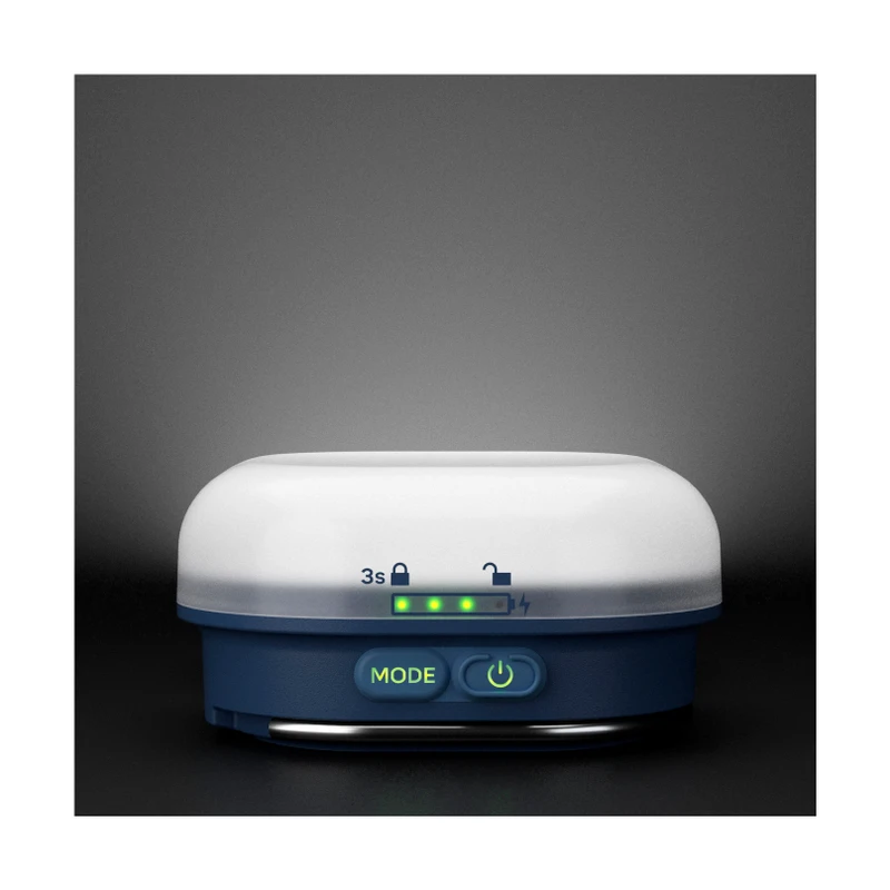 Aby sa predišlo nechcenému zapnutiu nabíjateľnej kempingovej lampy počas jej prenosu v batohu alebo vo vrecku, obsahuje šikovnú funkciu uzamknutia ovládania. Podržaním tlačidla zapnutia/vypnutia pri vypnutej lampe na dlhšie ako 3 sekundy sa tlačidlá uzamknú. Pri pokuse o zapnutie nabíjateľnej kempingovej lampy sa rozbliká malé červené svetlo pri ikonke zámku signalizujúce jej uzamknutie. Následným podržaním tlačidla zapnutia/vypnutia sa nabíjateľná kempingová lampa odomkne.